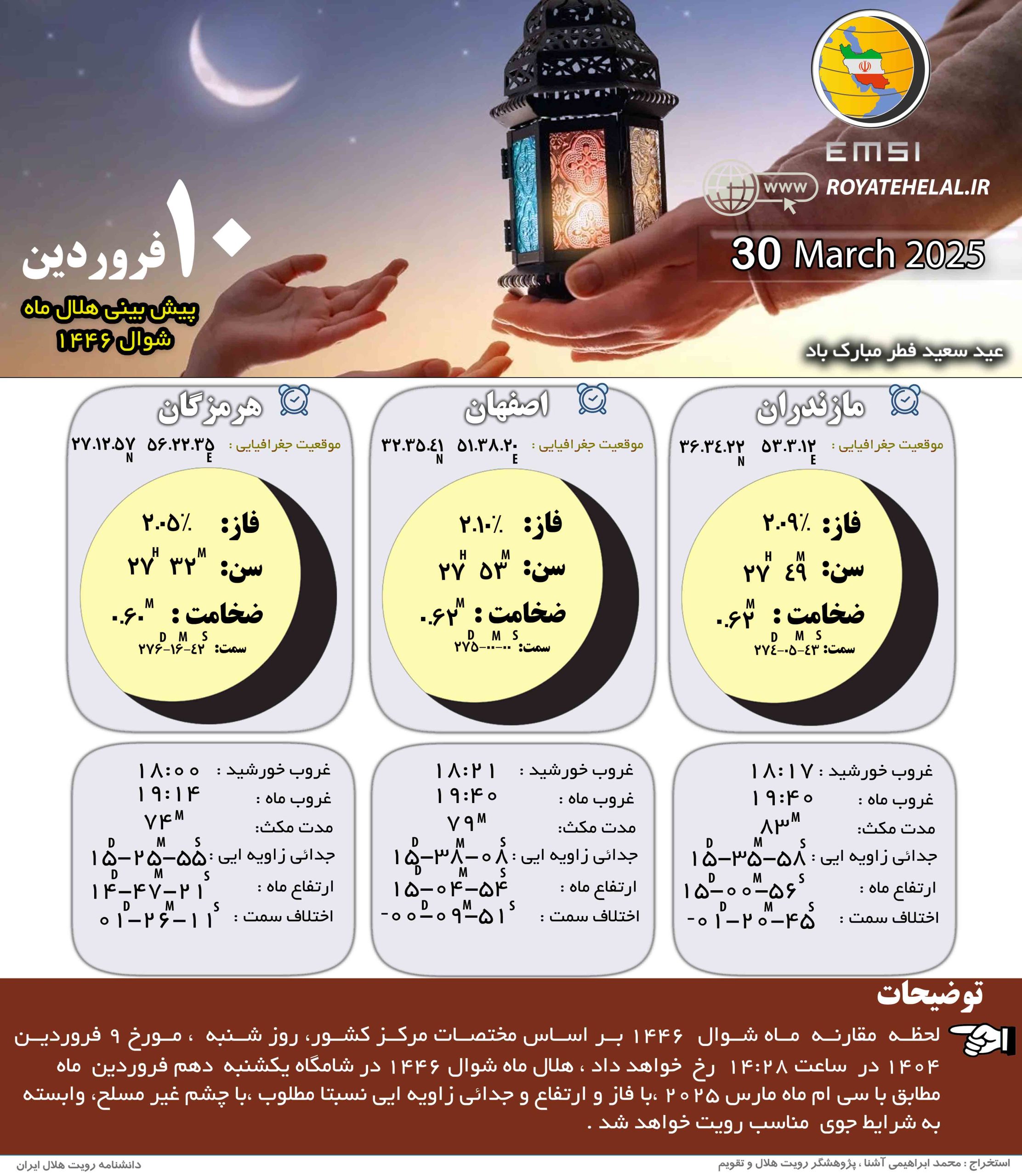 با سلام و تقدیم احترام ،بدینوسیله پیش بینی هلال ماه شوال ۱۴۴۶ در این پست مورد بررسی قرار می گرفته و تقدیم شما بازدید کننده گرامی می گردد . هلال ماه های قمری در سه نقطه جغرافیایی کشور (شمال . مرکز .جنوب ) مورد بررسی قرار می گیرد و وضعیت خط رویت برای رصدگران هلال، محرز و مشخص خواهد شد . این دانشنامه به بررسی هلال های صبحگاهی نمی پردازد . جهت مشاهده پیش بینی هلال ماه شوال ۱۴۴۶ به ادامه مطلب مراجعه کنید و جهت بزرگنمایی روی آن کلیک نمایید .